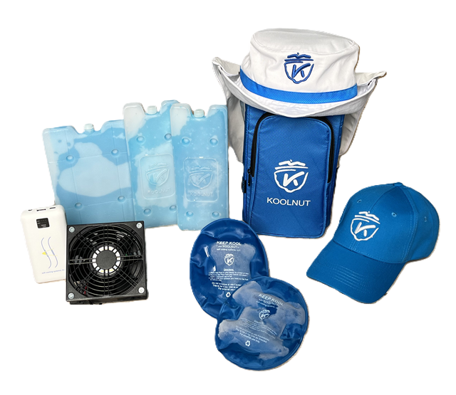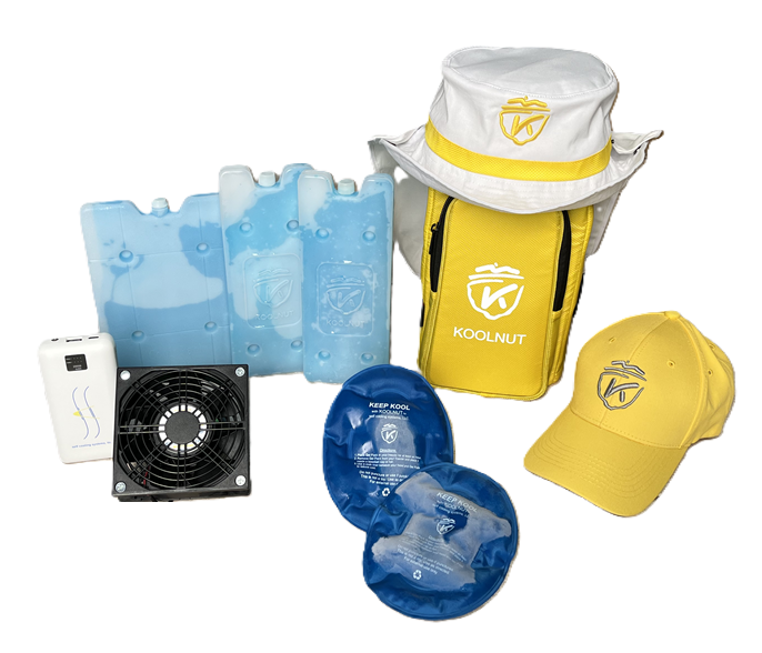 Our personal cooling system was designed to keep you comfortable in the scorching heat by cooling your head and neck. The system features a small backpack with integrated ice-bricks and a powerful fan to chill and blast refreshing cool air onto your neck and head. Along with the chilled air is our KOOLNUT, an oval-shaped gel pack that stays soft after freezing and fits inside a baseball cap or hat to cool your head instantly. By cooling these two critical areas, this innovative system optimizes body temperature regulation and reduces the risk of heatstroke in hot environments.